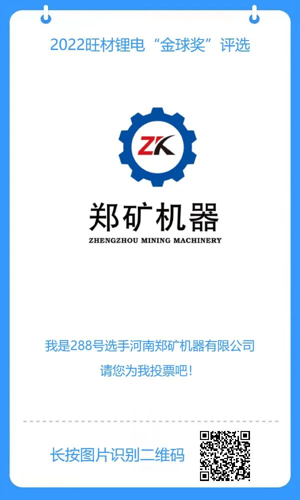 “動力電池行業(yè)奧斯卡”2022旺材鋰電“金球獎(jiǎng)”評選活動正在火熱進(jìn)展中,旨在由業(yè)界共同推薦、評選2022年行業(yè)中具有公信力的產(chǎn)品和企業(yè)品牌,以達(dá)到激勵(lì)行業(yè)技術(shù)創(chuàng)新的目的。評審時(shí)間為11月1日-11月28日;最終獲獎(jiǎng)名單將在11月28日晚舉行的2022旺材鋰電金球獎(jiǎng)?lì)C獎(jiǎng)典禮上隆重揭曉。希望投出您寶貴的一票,讓鄭礦機(jī)器能夠脫穎而出!